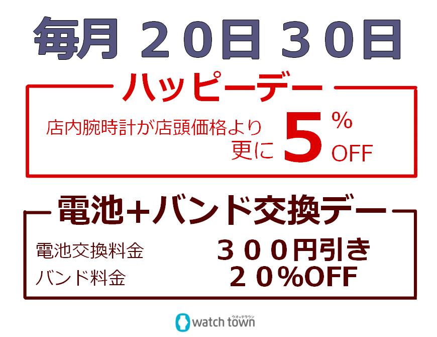 毎月20日・30日は電池交換とバンド交換がお安くなる、