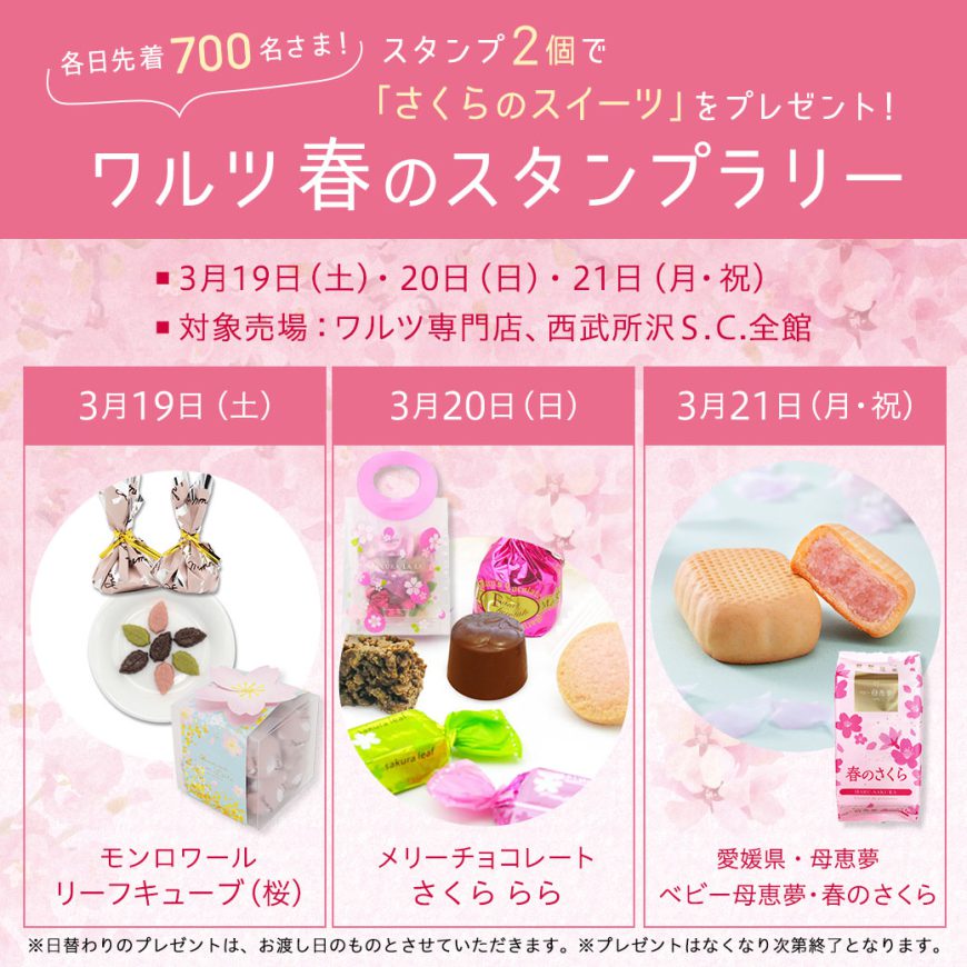 会期中、下記の1・2のお買いあげスタンプを各1個、計2個を集めた各日先着700名さまに、日替わりで「さくらのスイーツ」をプレゼント!