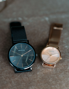 色の異なる美しいペアウオッチ。二人の想い出にどうぞ。