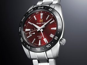 ブラックのベゼルとダークレッドのダイヤルは、スプリングドライブムーブメントがつくられる「信州 時の匠工房」から望む穂高連峰の険しい岩肌があらわになる、鮮やかな夏の朝焼けの情景を表現しています。深みのあるダイヤルに映えるシルバーのGMT針が、視認性を高めます。