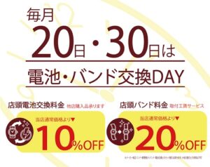 ニッケコルトンプラザ店では、毎月20日・30日に電池・バンド交換DAYを実施しています。