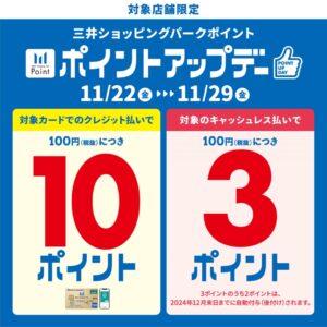 当店でお会計の際、三井ショッピングパークカード《セゾン》をはじめとした、対象カードのお支払い及びご提示で