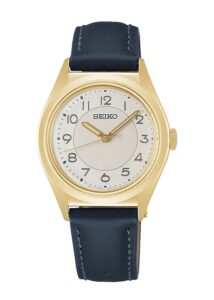ネイビーのレザーバンドにイエローゴールドカラーのケースが