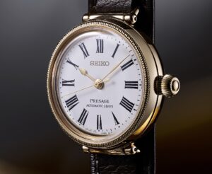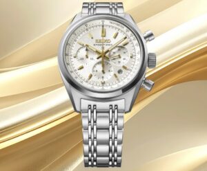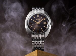 ゴールドをアクセントに、創業者・服部金太郎ゆかりの彫刻から着想を得た型打文様とグレーグラデーションのダイヤルを採用。薄型ケースと多列ブレスレットによる上質な着け心地も魅力です。