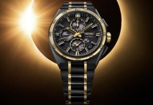 光をテーマにした型打文様のブラックダイヤルとゴールドカラーが美しく調和した特別仕様です。